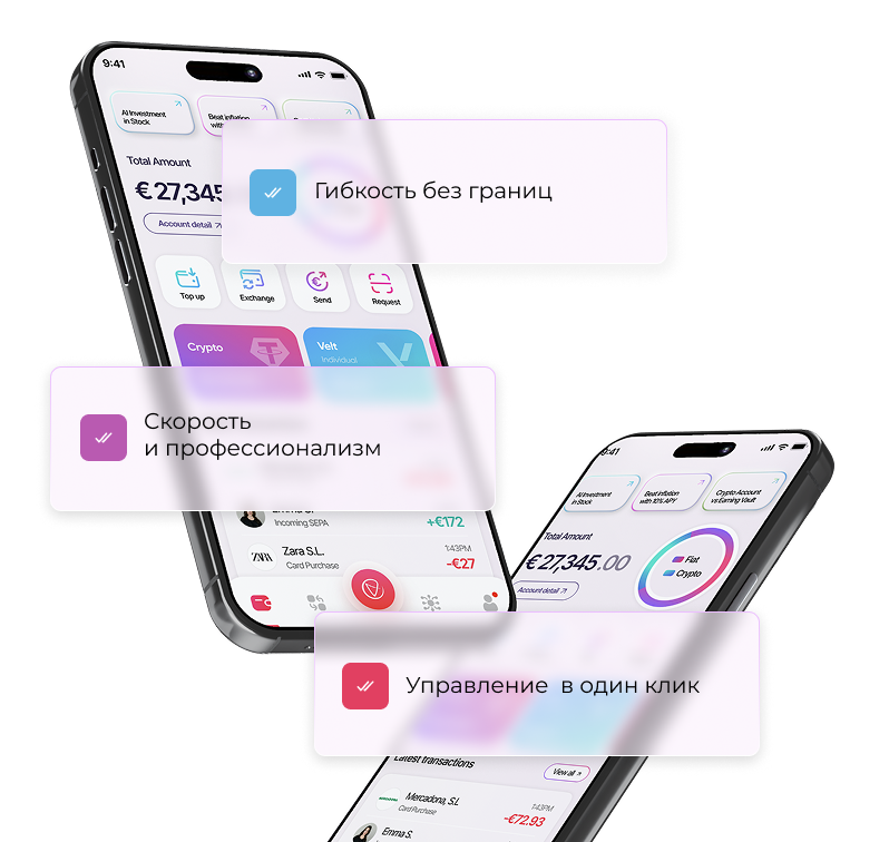 Экосистема VeltPay построена по принципу compliance-first и полностью соответствует требованиям KYC, AML и регуляторного контроля, что позволяет легально и безопасно интегрировать средства из различных источников в европейскую финансовую систему. Платформа поддерживает работу со сложными и нестандартными финансовыми моделями при строгом соблюдении нормативных требований, а также обеспечивает двусторонние операции между традиционными счетами и криптокошельками — пользователи могут пополнять счета и карты с цифровых активов и выводить средства обратно в криптоэкосистему.